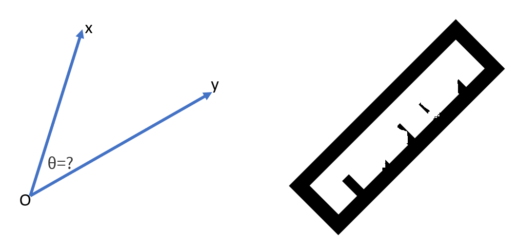 สมมติว่าเรามีเวคเตอร์ 2 อันคือ \(x\) และ \(yy\) และเราต้องการวัดมุมระหว่างเวคเตอร์ทั้งสองนี้ แต่โชคร้ายที่เราไม่มีไม้โปร เรามีแค่ไม้บรรทัดเก่า ๆ ที่วัดระยะอะไรไม่ค่อยได้แล้ว เราจะประมาณค่ามุม \(\theta\) ได้ยังไง?