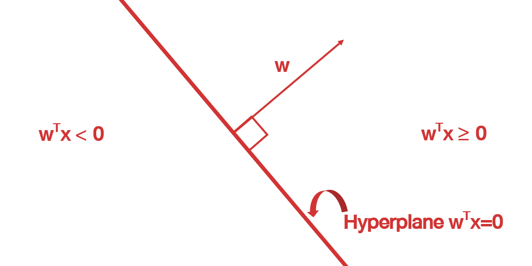 นั่นแปลว่าเวคเตอร์ \(w\) ใด ๆ สามารถแบ่งปริภูมิออกเป็นสองส่วนนั่นคือส่วนที่ dot กับ \(w\) แล้วเป็นบวกหรือ 0 และส่วนที่ dot แล้วติดลบ โดยที่ขอบเขตระหว่างสองส่วนนี้คือตำแหน่งที่ค่า dot เป็น 0 พอดี นั่นคือ cos ของ \(\pi/2\) หรือมุมฉาก ซึ่งขอบเขตนี้ก็คือ hyperplane หรือ ระนาบเกิน นั่นเอง