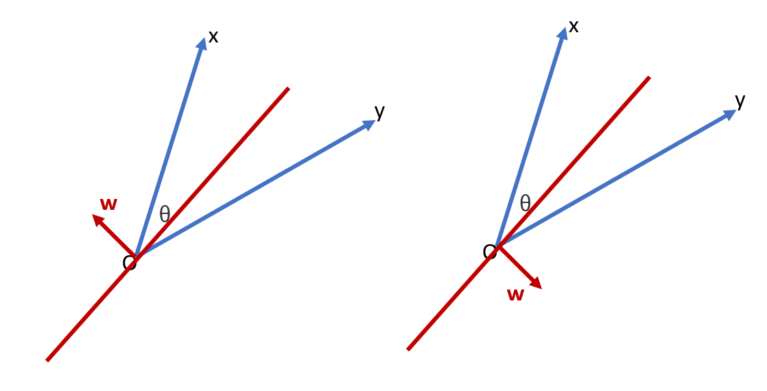 ความน่าจะเป็นที่จะสุ่มได้ \(w\) ที่แบ่ง \(x\) อยู่ในฝั่งบวก และ \(y\) อยู่ในฝั่งลบ (ภาพบนด้านซ้าย) ก็คือ \(\theta / (2 \pi)\) ซึ่งเท่ากับความน่าจะเป็นที่จะสุ่มได้ \(w\) ที่แบ่ง \(x\) อยู่ในฝั่งลบ และ \(y\) อยู่ในฝั่งบวก (ภาพบนด้านขวา) ดังนั้น